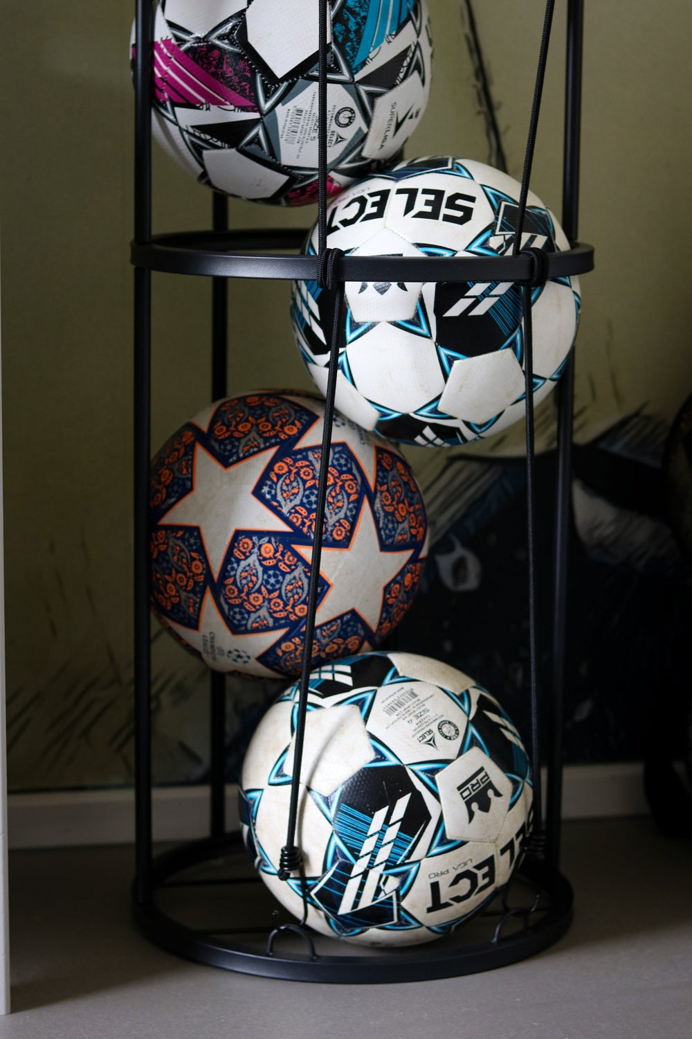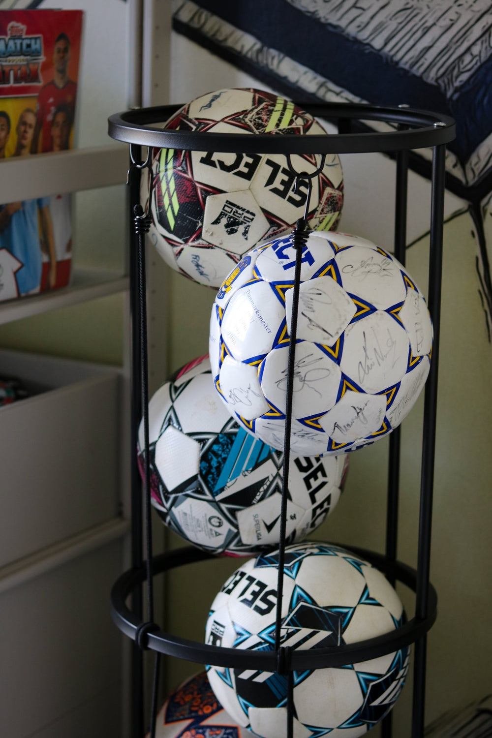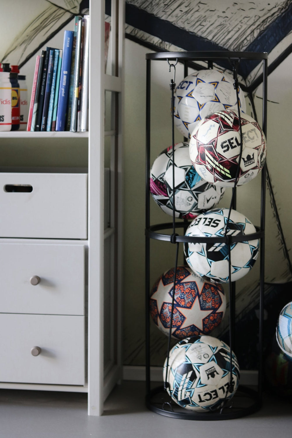 Med det här bollhållarstativet i stål kan du hålla ordning på dina sportbollar på ett enkelt och snyggt sätt. Perfekt för ett pojk-/flickrum.