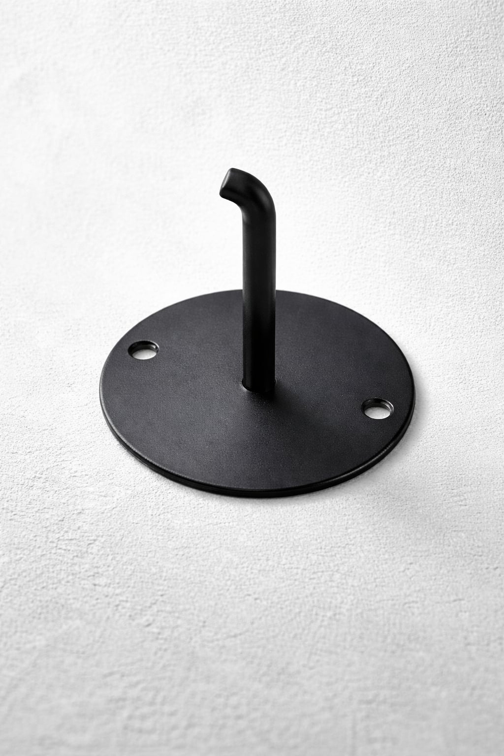 Denna svarta stålkrok är en funktionell och estetisk lösning för att hänga upp saker i hemmet med en rå och tidlös design.